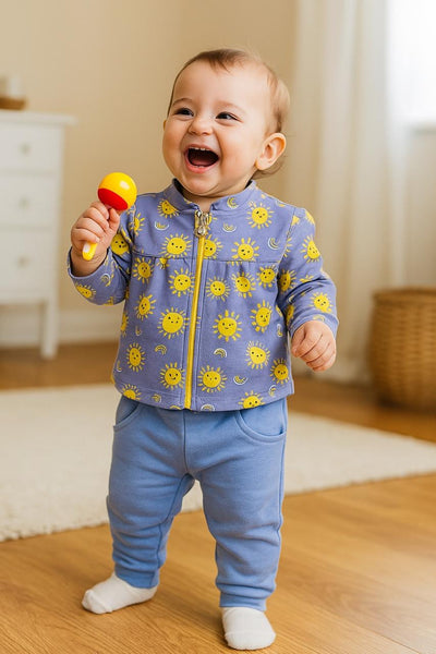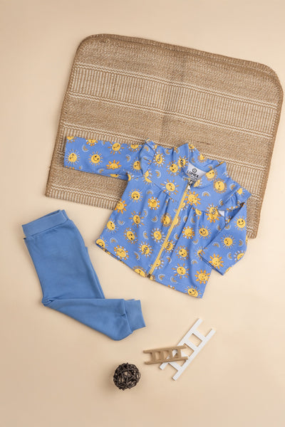 Wrap your little one in sunshine with our cozy cotton pajamas! The top is a cheerful blue, adorned with a playful pattern of sunny smiley faces. The full-length zipper ensures quick and easy diaper changes, making bedtime routines a breeze. Paired with soft, solid blue pants, this pajama set is the perfect blend of style and comfort