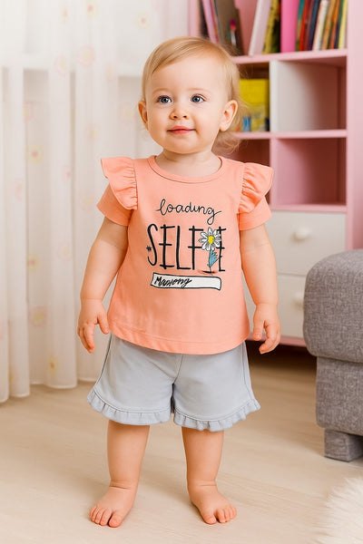 The set features a soft cotton, short-sleeved t-shirt in a sweet "simon" color – think a gentle, or perhaps a soft lavender. Adding a touch of playful charm, the t-shirt showcases a "cute loading selfie print word" right in the middle. Imagine a fun graphic with a progress bar and the word "selfie" playfully incorporated – guaranteed to bring smiles!