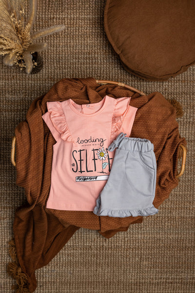 The coordinating shorts are crafted from a lovely gray cotton and boast a "perfect design cut" that ensures both comfort and style for your baby girl. A delightful detail is the inclusion of "two pockets adding a practical and cute element to the shorts.