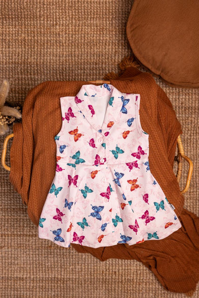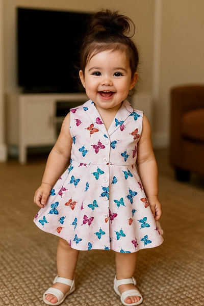 Absolutely adorable baby girl dress! This sleeveless design features a vibrant, all-over print of colorful butterflies dancing across a sweet pink backdrop. For easy dressing and changes, it has a practical button closure running the length of the dress. The charming fluffy design cut adds a touch of playful volume and makes it extra special.