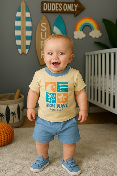 This sweet baby boy outfit features a soft beige cotton t-shirt that's perfect for little adventurers. The charming print showcases a cute high wave, bringing a touch of the ocean spirit to his wardrobe. Practical snap closures at the shoulder make dressing and changing a breeze. Completing the look are a pair of simple blue shorts with two handy pockets, ideal for tiny treasures. Comfortable and stylish, this set is perfect for everyday play.